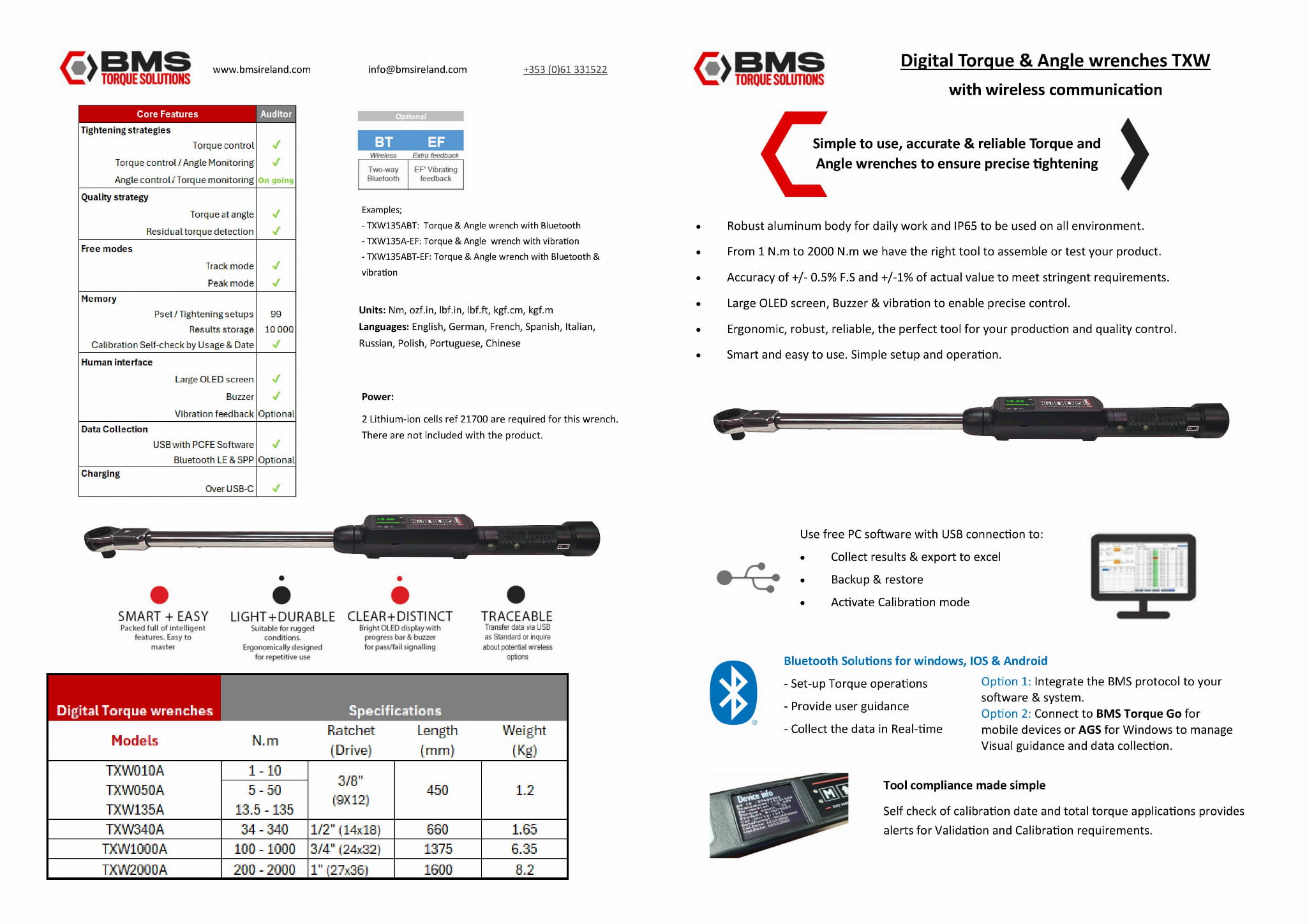 Wszystkie klucze elektroniczne z serii TWXA marki BMS, to najnowsze i najbardziej wytrzymałe narzędzia tej marki, dedykowane do najtrudniejszych warunków pracy - z klasą szczelności IP65. Cechują się bardzo wysoką dokładnością pomiaru momentu ± 1% w prawą i lewą stronę oraz precyzją pomiaru przesunięcia kątowego na poziomie 1°. Seria TWXA obejmuje modele od 1 Nm do 2000 Nm, każdy z wymienną grzechotką i możliwością zastosowania wymiennych końcówek płaskich lub oczkowych.